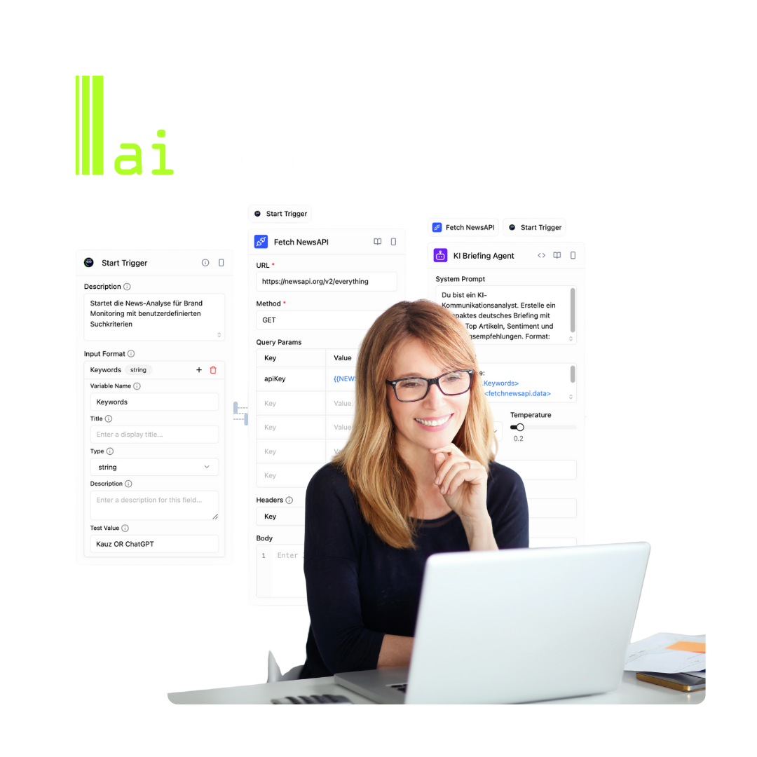 Your aiWorkflow admin does not need to have an IT background. However, basic technical knowledge of APIs, webhooks etc. will help with productive implementation. As part of our Workflow-as-a-Service, we are also happy to take over the design of the AI processes for you.
